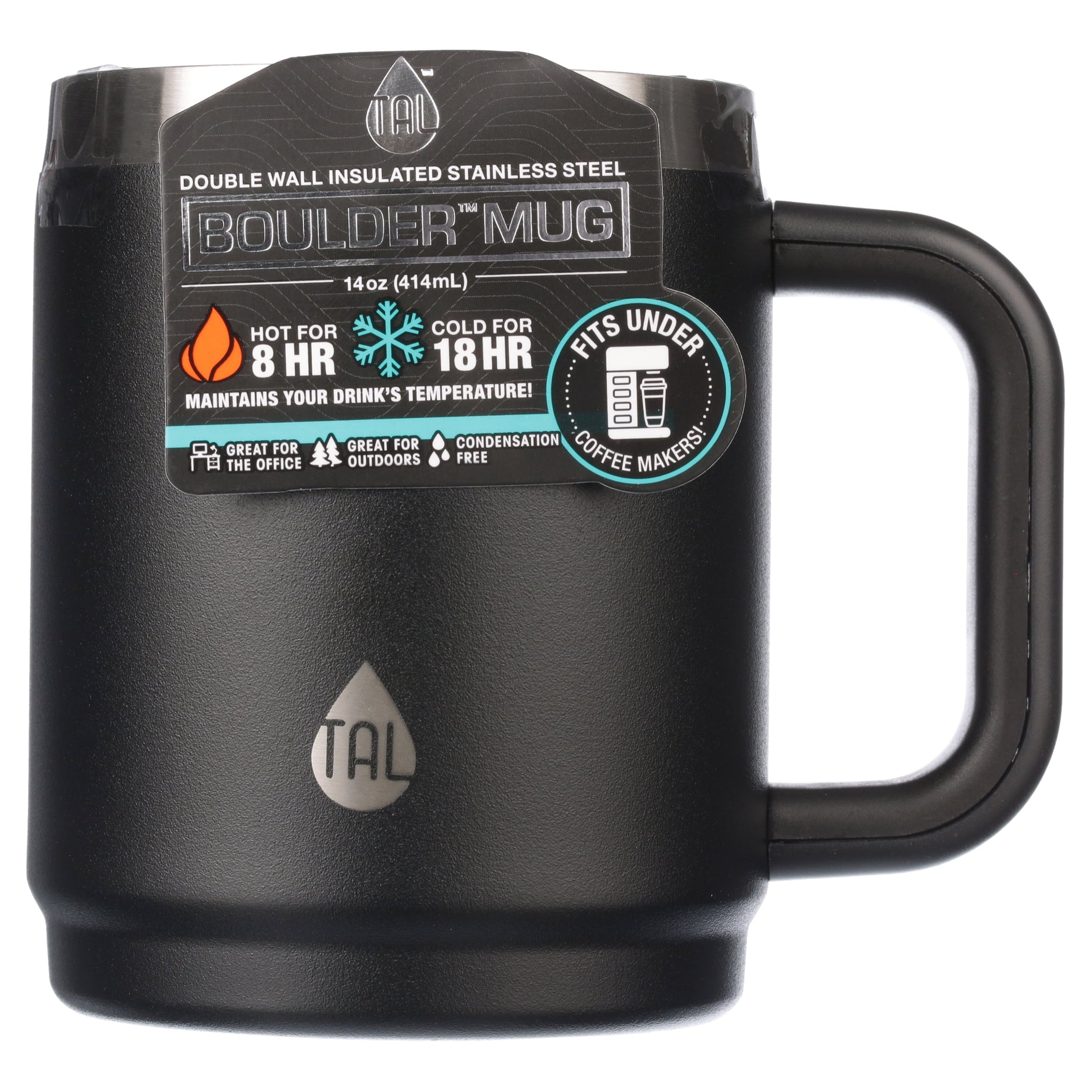 TAL Stainless Steel Boulder Coffee Mug 14oz, Black is great for coffee and tea drinkers when you prefer a mug with a handle. The Brew includes a sliding splash proof lid which is perfect for transport or carrying while on-the-go! The Brew's double wall insulation is dual purpose, allowing your favorite hot beverage to stay warm for hours or keeping your iced coffee or tea cold. The Brew fits under your coffee maker and the easy carry handle allows you to quickly grab and go. For Care and Use: , please wash in warm water with dish soap and a soft sponge
